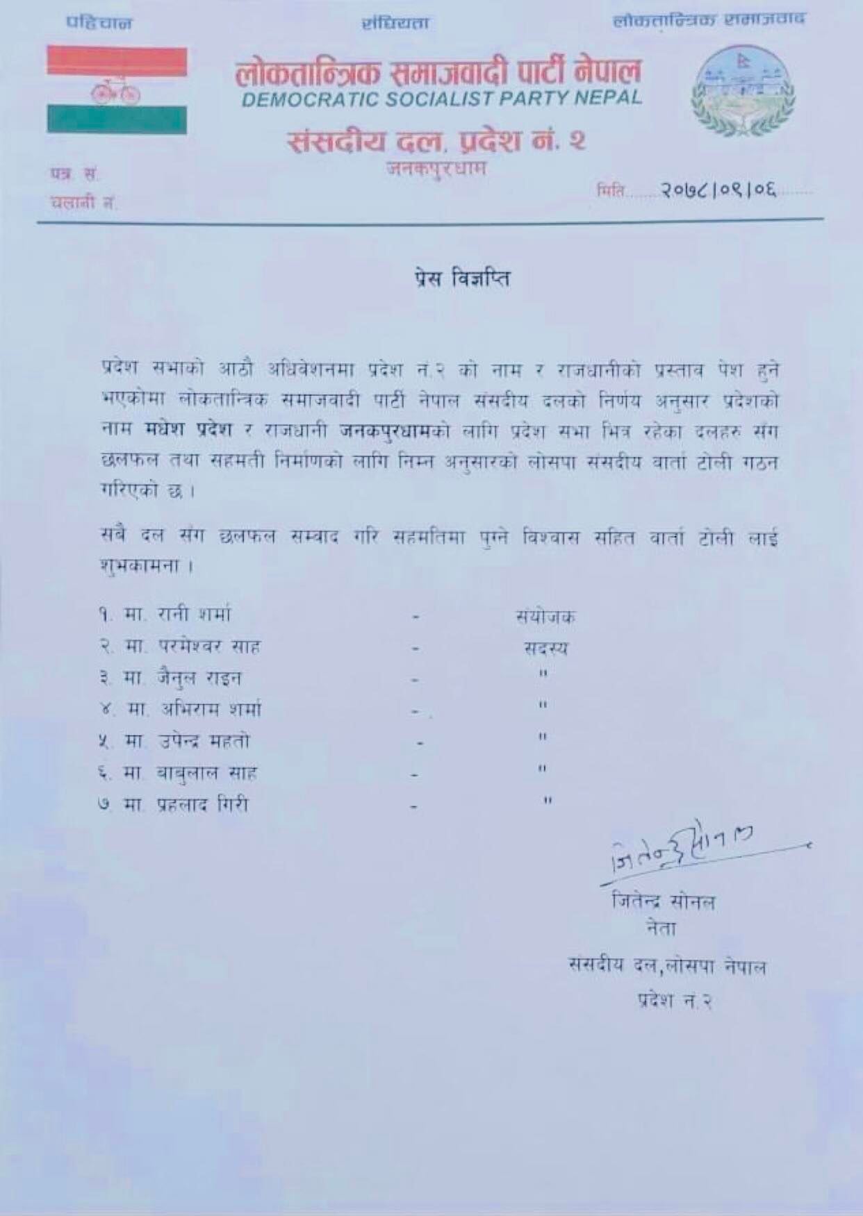 प्रदेश २ का प्रदेशसभा सदस्य रानी शर्माको संयोजकत्वमा सात सदस्यीय वार्ता समिति गठन गरेको छ । सो समितिमा सदस्यहरु प्रमेश्वर साह, जैनुल राइन, अभिराम शर्मा, उपेन्द्र महतो, बाबुलाल साह र प्रहलाद गिरी रहनु भएको छ । यो वार्ता समितिले प्रदेश २ का अन्य दलहरुसँग प्रदेश २ को नाम मधेश प्रदेश तथा राजधानी जनकपुरका लागि छलफल गर्ने प्रदेश २ लोसपा संसदीय दलका नेता एवं केन्द्रीय कार्यकारिणी समितिका सदस्य जितेन्द्र सोनलले जानकारी दिनुभयो ।