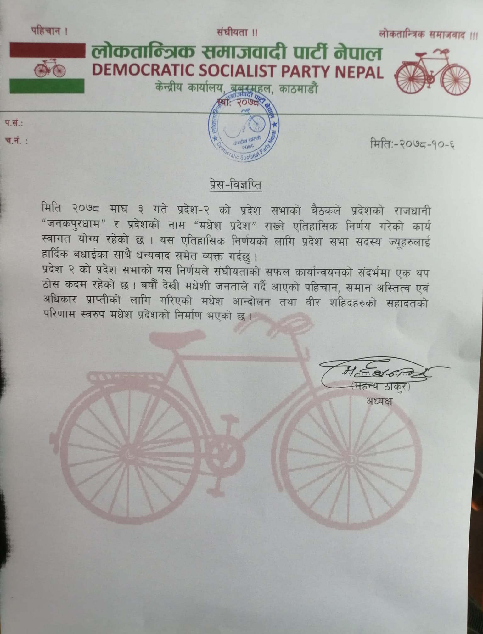 मधेश प्रदेश घोषणा भएकोमा लोसपाका अध्यक्ष महन्थ ठाकुरले दिनुभयो धन्यवाद