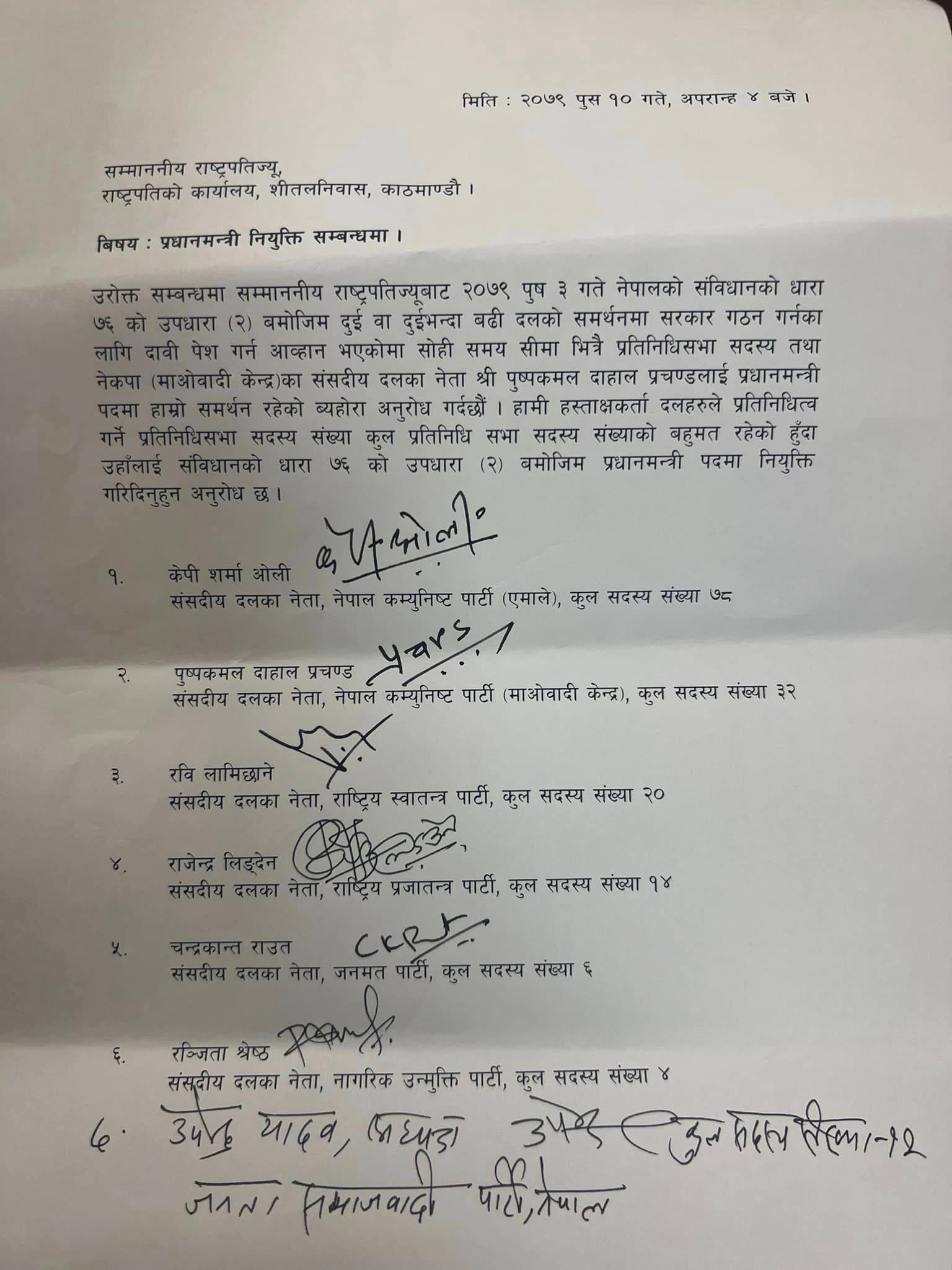 प्रचण्डलाई प्रधानमन्त्रीमा समर्थन गरेका दलहरु