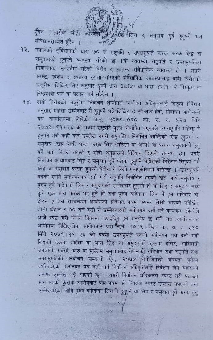 काठमाडौँ फागुन २८ गते । निर्वाचन आयोगले उपराष्ट्रपति चुनावका लागि जिम्मेवारी तोकिएको निर्वाचन अधिकृत महेश शर्मा पौड्यालले राष्ट्रपति र उपराष्ट्रपतिमा एक जना महिला नै हुनुपर्ने भन्ने संविधानको आशय नरहेको निर्णय सुनाउनु भएको छ । उपराष्ट्रपति निर्वाचनमा उम्मेदवारी दर्ता गरेका रामसहाय प्रसाद यादवविरुद्ध एमालेका उपराष्ट्रपति उम्मेदवार अष्टलक्ष्मी शाक्य र जनमत पार्टीका उपराष्ट्रपति उम्मेवार ममता झाले गरेको दाबी विरोधमाथि फैसला गर्दै निर्वाचन अधिकृत पौडेलले दुवैजनाको दाबी विरोधको दाबी पुग्न नसकेको भन्दै जसपाका राम सहाय यादवको उपराष्ट्रपत्तिको पदको उम्मेदवारको मनोनयनपत्र खारेज गर्नुपर्ने नदेखिएको निर्णय गर्नुभएको छ ।