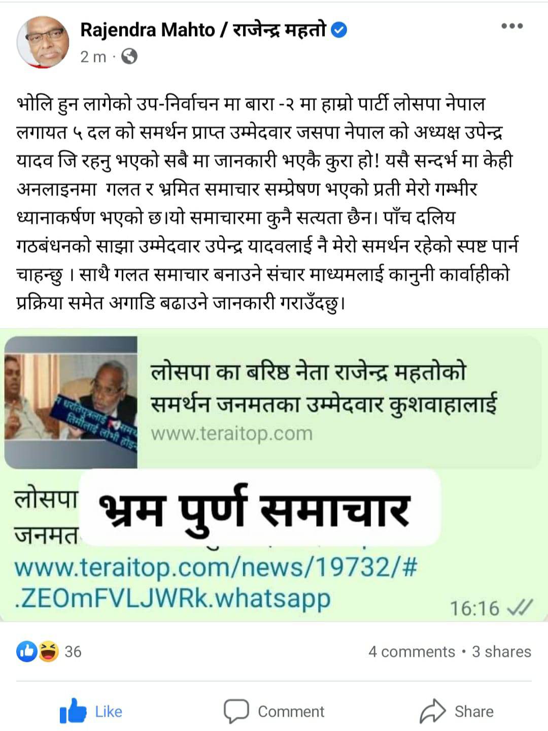 एउटा कुनै अनलाइनले ‘लोसपा वरिष्ठ नेता राजेन्द्र महतोको समर्थन जनमतका उम्मेदवार कुशवाहालाई’ भनि समाचार सम्प्रशन गरेपछि नेता महतोले विज्ञप्ति जारी गरेर सो कुरा स्पष्ट पार्नुभएको हो ।