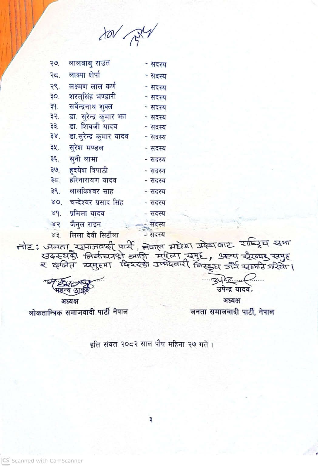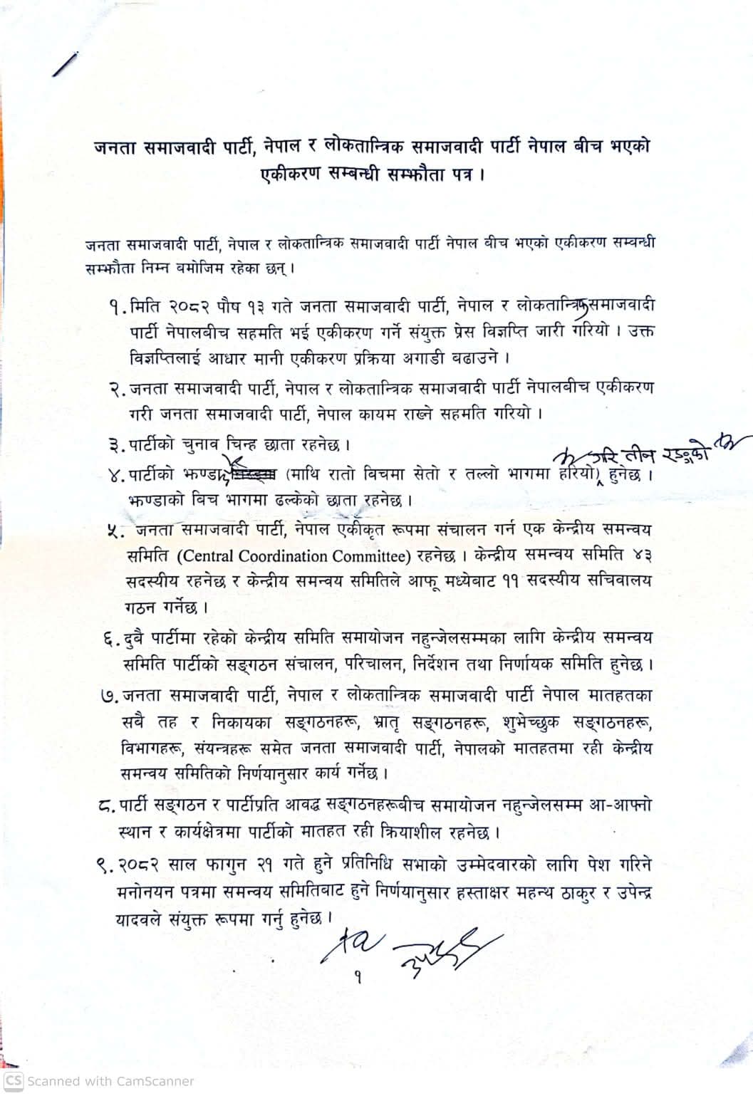 जसपा नेपाल र लोसपा बिच एकता भएको सम्झौता पत्र